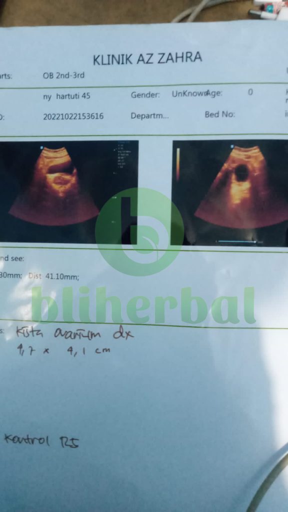 Setelah 1 bulan konsumsi, saya sudah tidak merasakan nyeri sampai tulang belakang, dan nafsu makan saya meningkat. 8 Mei 2025 saya periksa lagi, hasilnya kista 6 cm di kiri hilang total dan yang di kanan mengecil dari 6 cm jadi 2 cm.